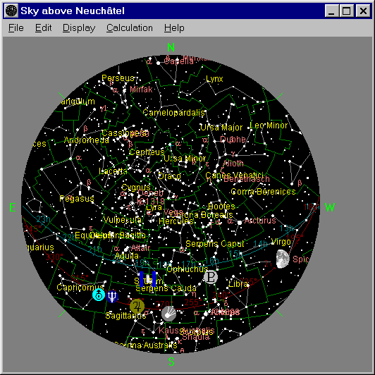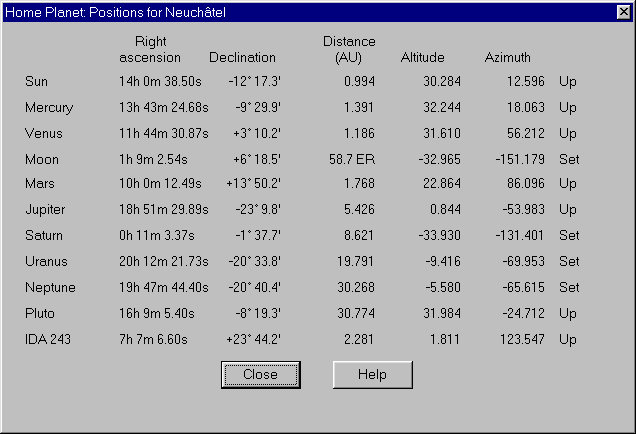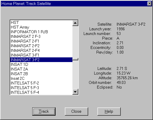 Release 3.3a of Home Planet, a comprehensive astronomy / space / satellite-tracking package for Microsoft Windows 95/98/Me and Windows NT 4.0/2000/XP and above, is now available; see details at the end on how to download and install the software. Release 3.3a of Home Planet is a native 32-bit Windows application which cannot be used on Windows 3.1; if you have such a system, download Home Planet Release 2, which remains available.