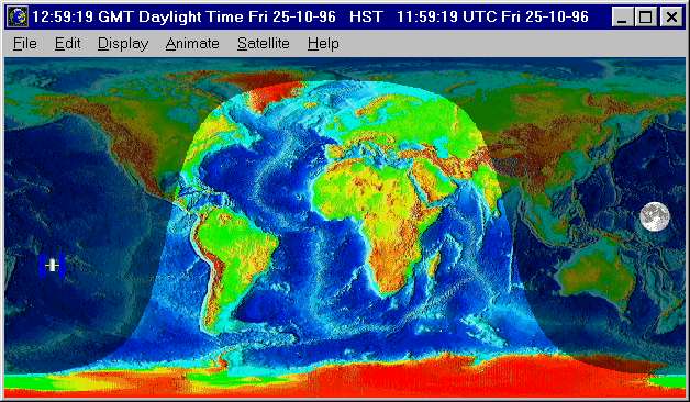 Once the screen saver is extracted into the system directory, use the “Display” item in the Control Panel to select the screen saver. The only configuration parameter is whether the Moon is displayed on the map. In August of 2006 the screen saver was updated to use the NASA natural colour cloudless Earth map. If you prefer the original topographic map, or the current version of the screen saver refuses to run on older systems such as Windows 95 and 98, you may continue to download the original release.