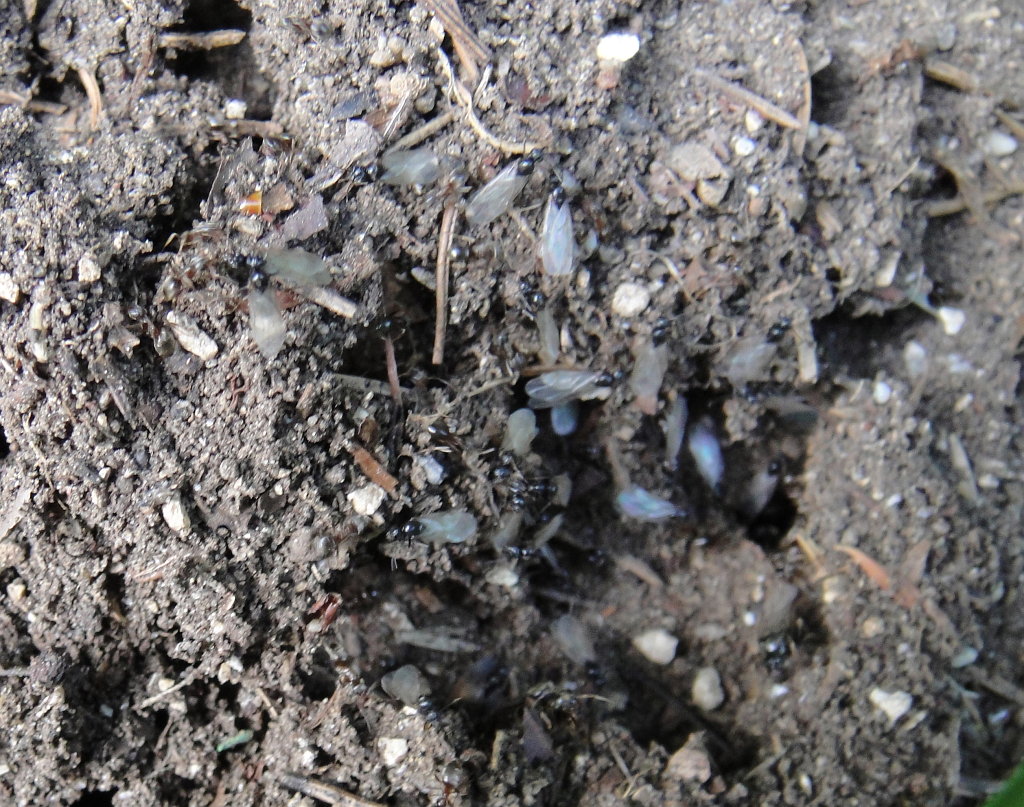 Through a process nobody (as far as I know) understands, all of the ant colonies of a given species in a given vicinity launch their fertile females and male drones around the same time, allowing new colonies to be established with a genetic reshuffle amongst colonies. Here are drones emerging from an anthill in the Jura mountains. The drones come out into the open and spend some time waiting for their wings to dry and harden, and then take flight, looking for females with whom to mate. Whenever the flying ants take to the air, dragonflies, like this fellow, are usually around to devour them in large numbers. Only a tiny fraction of the drones ever mate with a female, and of females who do mate, a minuscule percentage successfully found new colonies. It's tough being an ant, especially if you're a guy.