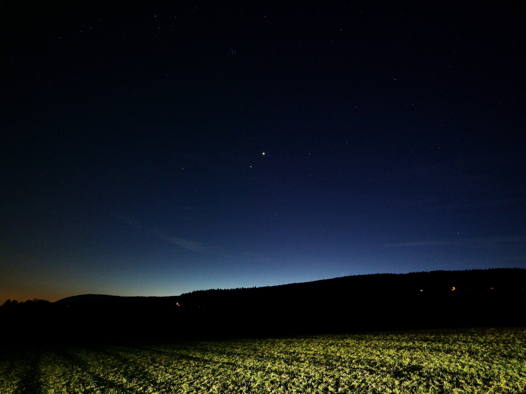 Leica M9 with TRI-ELMAR-M 1:4/16-18-21 ASPH at 16mm, f/4, 8 sec., ISO 400. Note the Pleiades (M45) above Jupiter near the top of the frame. The field in the foreground was illuminated during the exposure by the headlights of a passing automobile. Here's an annotated sky map from Your Sky.