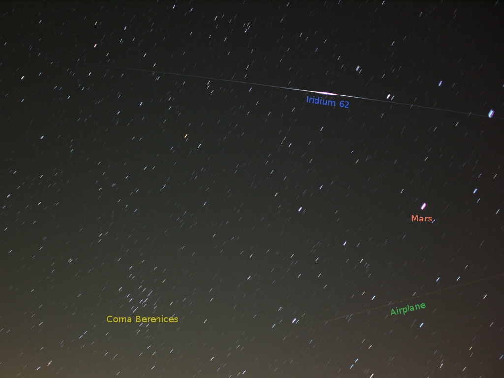 This image shows a flare of sunlight reflected from the main mission antenna of Iridium 62. The peak of the flare was at 19:33:20 UTC on 2012-03-16 at magnitude −8 as observed from Fourmilab (the flare centre was just 5 km east of where I took this picture). Mars, a passing airplane (its blinking red navigation light is visible) and the hairy constellation of Coma Berenices are visible in the picture. The photo is a 90 second exposure at ISO 160 with a Leica M9 with a SUMMICRON-M 1:2/35 ASPH 35mm lens at f/2. I made the exposure manually with a shutter setting of “B” with a cable release. Here is a map of the sky at the time of the flare courtesy of Your Sky.