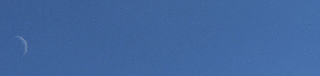 Taken around 14:30 UTC from 47° N 7° E. Note how Venus has much greater surface brightness than the Moon. The sky was not very transparent, and I was just able to glimpse Venus with the unaided eye. Through 15×50 binoculars, Venus was easy and appeared as a bright crescent.