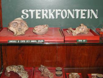 | In a locked vault (the "Broom Room") in the basement of the Transvaal Museum in Pretoria is the skull of "Mrs. Ples", the first adult specimen of Australopithecus africanus discovered. It was found on April 18, 1947 by Dr. Robert Broom at the Sterkfontein Caves near Johannesburg. The name "Mrs. Ples" comes from the original name given to the species, Plesianthropus--almost human. The skull is approximately 2.5 million years old. Australopithecus africanus walked upright and had a brain approximately the size of a modern chimpanzee's. This skull remains the most complete known cranium of the species. The public exhibit in the museum is a cast replica of the fossil shown here. |