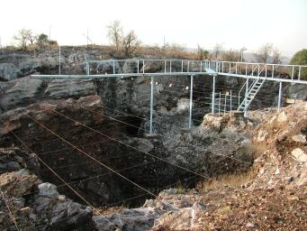 | Excavations at Sterkfontein continue to the present day. A reference grid is seen in this view of the region in which the skull of Mrs. Ples was discovered. A plaque commemorating the discovery is visible on the far side of the excavation at the site where the skull was found. |