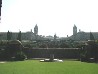 | Union House in Pretoria is the seat of the South African government (the legislature sits in Cape Town and the judiciary in Bloemfontein). The building is set on a hill overlooking Pretoria and is surrounded by extensive meticulously maintained gardens. I was enormously impressed by these gardens when I first visited South Africa in 1991 and found them just as magnificent ten years later. Union House was originally built as the capitol of the Union of South Africa, established in 1910, incorporating the former British colonies of the Cape and Natal, and the Transvaal and Orange Free State, conquered by the British in the Anglo-Boer War of 1899-1902. This view of Union House is taken from the lawn in the middle of the gardens, unfortunately backlit by the low noontime Sun of southern hemisphere winter. |