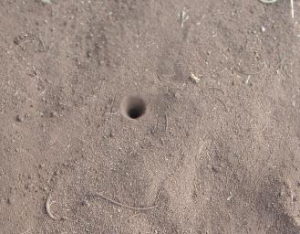 | In sandy soil in southern Africa you'll often encounter small (about 2cm) conical pits like this one. These are dug by Antlions, larvæ of insects of the family Myrmeleontidae. An Antlion is a pint-size version of the Sarlacc sand monster in Return of the Jedi--it lurks at the bottom of the pit it's dug and devours anything unlucky enough to fall in, principally ants. A voracious feeder, it eventually metamorphosises into a flying insect resembling a dragonfly. |