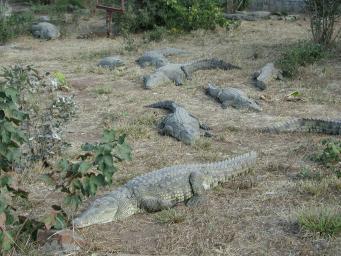 | A few kilometres on the Zambian side of the Zimbabwe/Zambia border at Victoria Falls is a crocodile ranch. The owners raise Nile Crocodiles (Crocodylus niloticus) commercially for leather and meat at a larger facility elsewhere in Zambia, but this is purely a tourist attraction which exhibits mischievous "problem crocodiles" removed from the Zambezi river. Although called the "Nile Crocodile", the species is found in rivers and swamps throughout non-arid regions of Africa. Some of the crocs here are huge--up to five metres in length. You can get quite close to the crocodiles on elevated walkways which criss-cross the facility. The Sun was out when we visited and most of the crocodiles were basking in the fields. There are large pools of water, and it is extremely spooky to see how an enormous crocodile can simply disappear as it glides in and sliently submerges. Swimming in the Zambezi is an extraordinarily poor idea; if you manage to evade the crocodiles, you'll probably be killed by a hippopotamus. |
