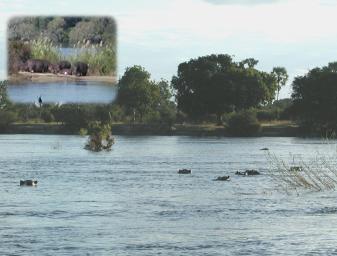 | Hippopotamus (Hippopotamus amphibius) are abundant in the rivers of southern Africa: we saw (and heard) them in the Zambezi and Luangwa in Zambia, and the Okavango in Botswana. What you usually see is illustrated here--just the silhouette of the head or only the eyes emerging from the water, and that only sporadically. We spotted these hippos in the Zambezi from a small boat we took from The River Club where we were staying on the Zambia side. Hippos usually come out of the water by night and only infrequently by day. The inset shows a group of four hippos we spotted on an island in the Zambezi. The pink colour is not a photographic artefact--hippos secrete a pink, oily substance which acts as sunscreen and keeps their skin moist when they're out of the water; they were once thought to sweat blood, which actually only Windows software developers do. Despite their ungainly appearance on land, they move quickly and gracefully in the water. They are aggressive, have little fear of humans, and are considered among the most dangerous of African mammals. When startled while grazing at night, a hippo will bolt for the nearest water, trampling anything and anybody in its path. |