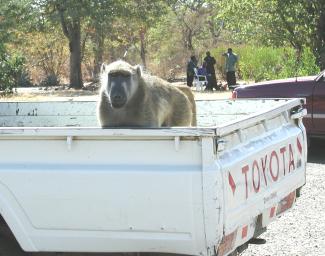 | The Zambezi river forms the border between Zimbabwe and Zambia. The border crossing is a bridge which affords a magnificent view of the falls. Every time you cross the bridge you have to go through exit and entry formalities for the respective countries, so you can end up with a lot of stamps in your passport. If a lot of people are waiting to cross the border it can take a while, but not to worry because there is ample entertainment. Several troops of baboons (Papio ursinus) frequent the area and are into everything. It is a bad idea to leave anything in an open vehicle where these bad actors may lay their not-so-gentle hands upon it. They also have extremely impressive teeth which they're apt to show you if you get too close. Would you want to put your arm into the back of this pick-up truck to rescue your camera? |