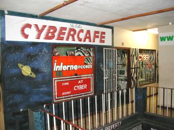 | After taking in the glorious vistas of the falls, the only thing remaining to make a perfect day is to, you know, check E-mail. Fortunately, a few minutes walk from the hotel brings you to one of two Internet Cafés in Victoria Falls. This establishment has about 10 PCs which share what appeared to be a 56 Kb dial-up connection--perfectly adequate for E-mail and confirming that all was well at Fourmilab in my absence. |