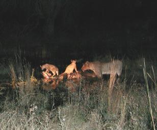 | Lunchtime, kiddies! Two cubs savour the delectable organ meat of the deceased bovid (whose head and one ear are visible at the left) as mom glares at a male lion approaching from the right. The lionesses having made the kill, he's arrived for meal time. |