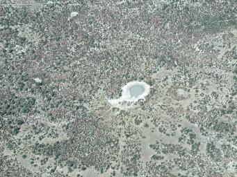 | In the semi-arid regions of southern Africa, wildlife survives the dry season by visiting waterholes like this one, photographed on the flight into Vumbura Camp, Botswana. The trails used by animals which frequent the waterholes are clearly visible extending radially outward into the bush. Elephants play an important rôle in maintaining waterholes, as their wallowing for mud baths keeps the waterholes from filling up with silt. |