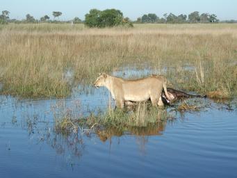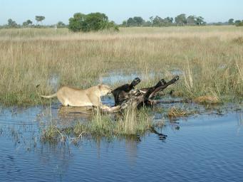 | If you're a lion, a dead water buffalo has many admirable qualities which, regrettably, have but a short half life when said buffalo is left in warm and shallow water. Here the lioness is attempting to drag the carcass from the water onto dry land at left. She managed to rotate the carcass "four in the air", but no further...there's never a fork lift when you need one. |