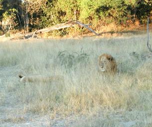 | Here's another pair of lions we encountered later in the day. This was a mated pair--trust me--but don't look for proof here at G-rated Fourmilab! Neither lion paid the slightest attention to our Land Rover. |