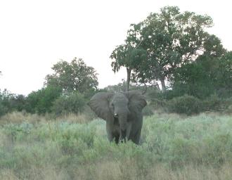 | As dusk approached, we came upon a group of African Elephants (Loxodonta africana) passing from right to left in front of our Land Rover. Most proceeded into the trees, but one bull clearly had an attitude problem. After the rest of the family had disappeared into the bushes, he turned and looked at us head-on. Clearly, having lost one tusk in an earlier dispute, he was not averse to violence. Fortunately, he settled for a intimidating glare as opposed to an obliterating charge. |