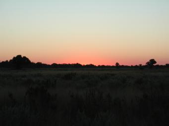 | There are sunsets, and then there are African sunsets. Botswana has what may be the most transparent skies of any landlocked area on Earth. The nation is essentially unpopulated--fewer than 1.5 million people in an area larger than Texas with most in a few urban centres. Unlike central Australia, there is abundant humidity and precipitation to clear the air of dust. This is a Botswana sunset...the land extends to the horizon and the cosmos reveals its infinite depth above. Indeed...not long after sunset the pellucid skies of Botswana render the zodiacal light almost bright enough to read a newspaper, the Magellenic clouds obvious, and the bulge at the centre of our galaxy apparent at the slightest glance. So transparent is the sky that on the previous day I spotted Venus in broad daylight, clearly visible against the blue sky just before noon. |