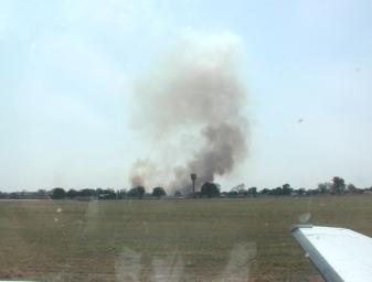 | Weather forecasts indicated an excellent probability of cloudless skies for the eclipse, but one worry was obscuration due to smoke from the winter burning of fields widely practiced in southern Africa. Indeed, when we flew into Mfuwe airport in Zambia the day before the eclipse, the sky was murky with it, with several pillars of smoke rising into the sky, including this one from a burn near the airport. Fortunately, eclipse day had been declared a holiday in Lusaka, and there was little or no smoke in the air at our viewing site. |