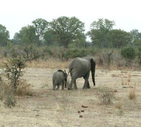| This elephant mother and baby were part of a group of five we encountered toward dusk (the original picture is quite dark--I've enhanced the brightness in the image here). They were moving away from us when we arrived and shortly disappeared into the trees in the background. |