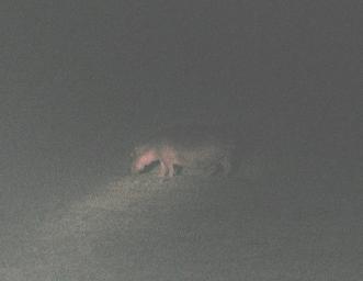 | Look, I know this is an awful picture, but it's the only close-up I got of a hippopotamus on land. Hippos generally leave the water to graze only at night. If you manage to see one on the land at all, odds are it will be in darkness when photographic conditions are marginal at best. If you go on one of these photo safaris, it's an excellent idea to bring a video camera with good low light performance, as you'll encounter nocturnal animals which can't be photographed any other way. Even though the CCD sensors used in digital still cameras have high quantum efficiency, no non-professional digital still camera I know of is adequate for circumstances like this. |