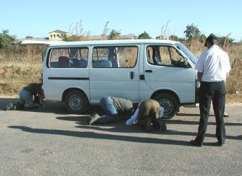 | The last thing you want on eclipse day is transportation trouble. The van which ferried us between Lusaka International and our observing site suffered a flat tyre, but thankfully after the eclipse. How many eclipse chasers does it take to change a wheel? Don't ask, they're sure to take umbrage. |