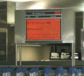 | Even on vacation, you can't get away from broken links! Here's the giant screen above the baggage claim carousel at Johannesburg airport bearing a message all too familiar to denizens of the Web. |