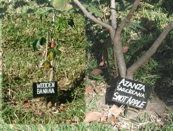 | The grounds of Kafunta River Lodge are landscaped with native trees, most with signs identifying them. Well, I ate the Mopani worms, but I think I'll pass on the fruit of these two trees. There's an error in the scientific name of the "Snot Apple"--it should actually be Azanza garckeana The "Wooden Banana" tree (Entandrophragma caudatum), which grows quite large, is also called the Mountain Mahogany. |