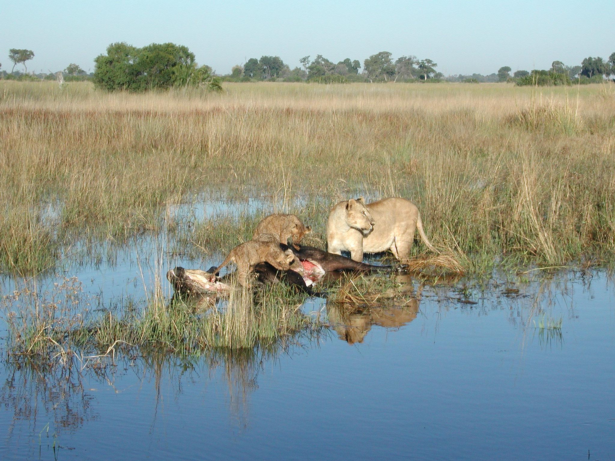 Lunchtime, kiddies! Two cubs savour the delectable organ meat of the deceased bovid (whose head and one ear are visible at the left) as mom glares at a male lion approaching from the right. The lionesses having made the kill, he's arrived for meal time.