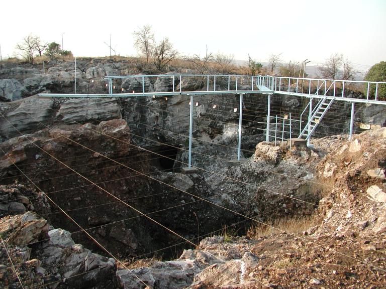 Excavations at Sterkfontein continue to the present day. A reference grid is seen in this view of the region in which the skull of Mrs. Ples was discovered. A plaque commemorating the discovery is visible on the far side of the excavation at the site where the skull was found.