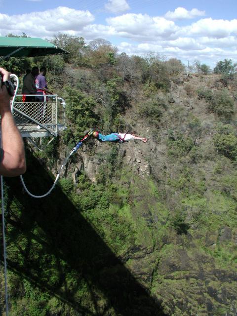 On the side of the bridge between Zimbabwe and Zambia looking away from the falls is a platform from which the truly insane bungee jump. The nutter caught in free fall in this picture wasn't satisfied with only one jump--he availed himself of the free second go afforded those who purchase a video of their first jump. Such a deal....