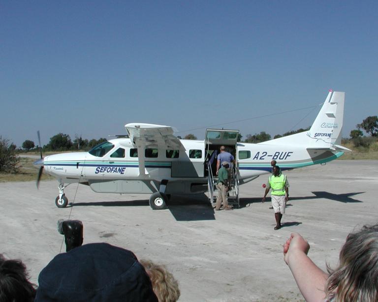 We departed Victoria Falls on the morning of June 17th, 2001 for Vumbura Camp in the Okavango Delta in a chartered Cessna Caravan, shown here on arrival at the Vumbura airstrip. We made a brief stop at the airport in Kasane to clear Botswana customs before proceeding to Vumbura Camp.