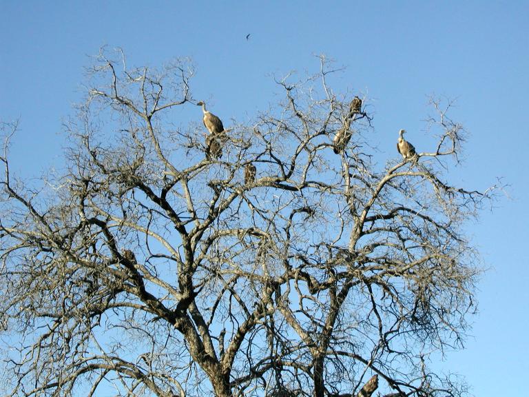 The next morning we set off to revisit the site of the buffalo kill to see what had transpired overnight. It was easy to find--an adjacent tree was full of Hooded Vultures (Necrosyrtes monachus), "just waiting".