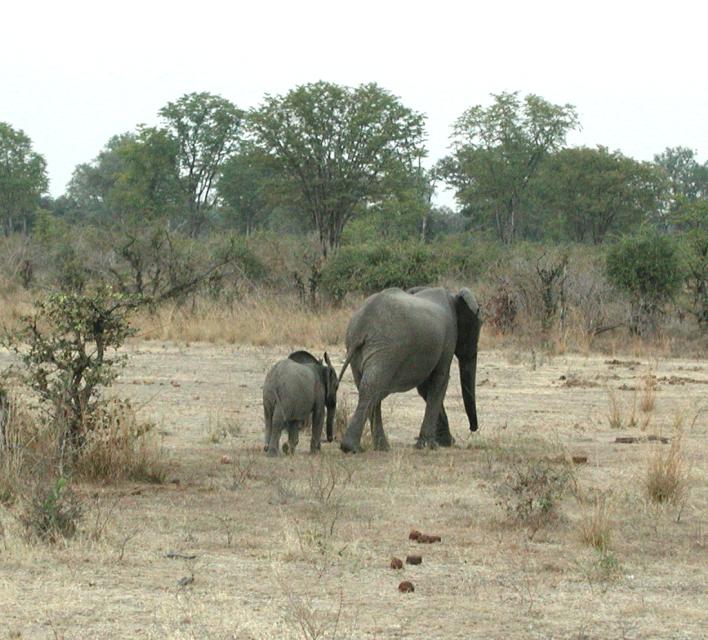This elephant mother and baby were part of a group of five we encountered toward dusk (the original picture is quite dark--I've enhanced the brightness in the image here). They were moving away from us when we arrived and shortly disappeared into the trees in the background.
