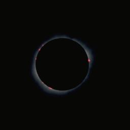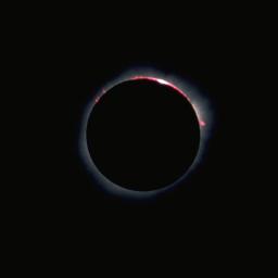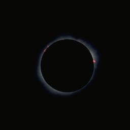 The motion of the Moon across the face of the Sun is evident when comparing this 1/1000 second shot taken 2/3 of the way through totality to the previous image from the half way point. The Moon has begun to block the prominence at the right and is revealing prominences at the lower left previously hidden behind the Moon's limb. |