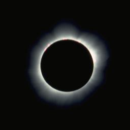 This 1/1000 second exposure was taken at mid-totality. The Moon, moving from lower left to upper right, has now occluded the red hydrogen alpha emission from the active region at the upper right. The large eruptive prominence at the 3 o'clock position is still very much in evidence. | |