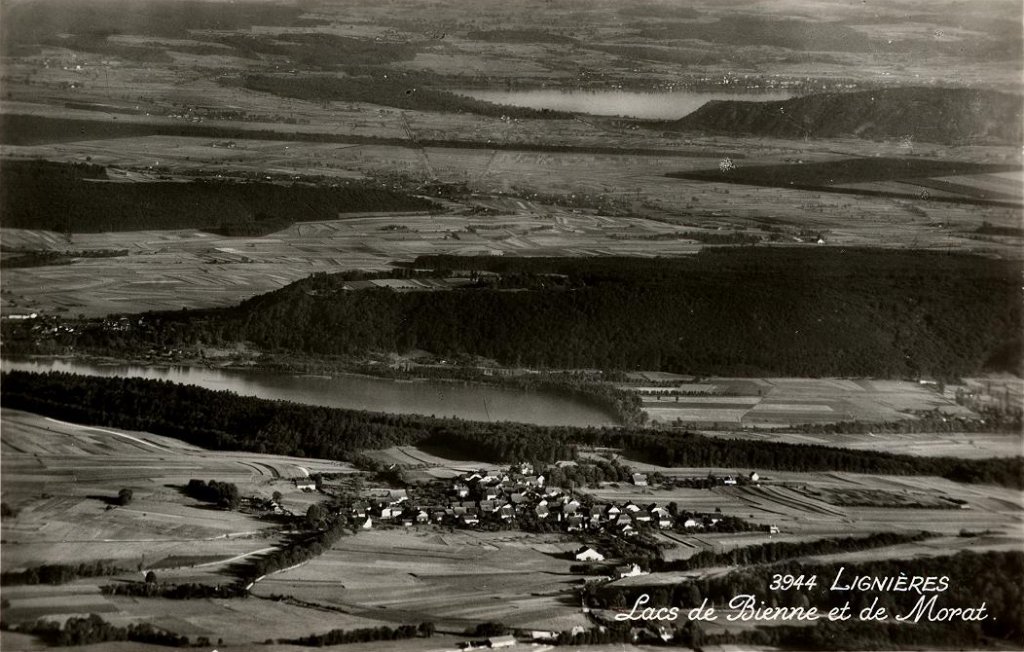 This photo, taken from the Chasseral, shows a closer view of Lignières than the panorama of the three lakes region from the same location. Here, the Lac de Bienne / Bielersee is visible behind (and 400 metres below) the village, and the Lac de Morat / Murtensee is visible at the top right.