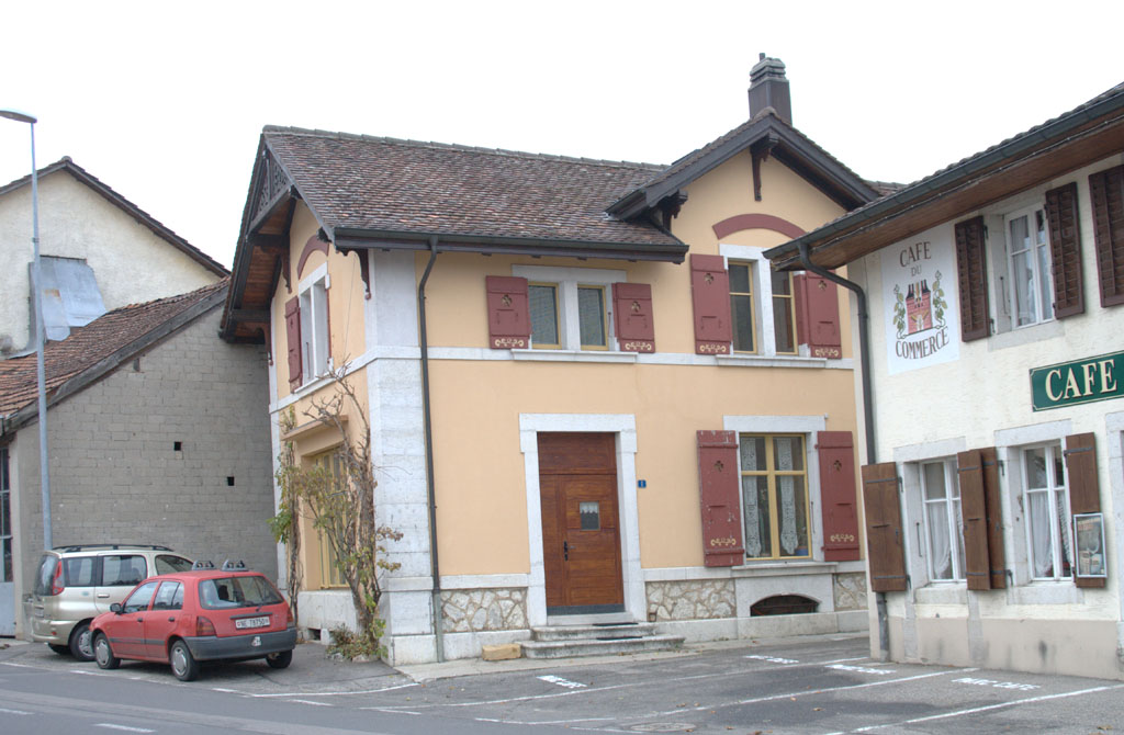 Proceeding along the Rue du Montilier, we encounter this small building (Rue du Montilier 6, RACN 010-6456-00238), which was constructed in 1898 for Albert Petitpierre, with a grocery store on the ground floor and residence upstairs. The Café du Commerce (Rue du Montilier 2, RACN 010-6456-00052) can be seen to the right; we'll discuss it in more detail as we look back from further up the street.