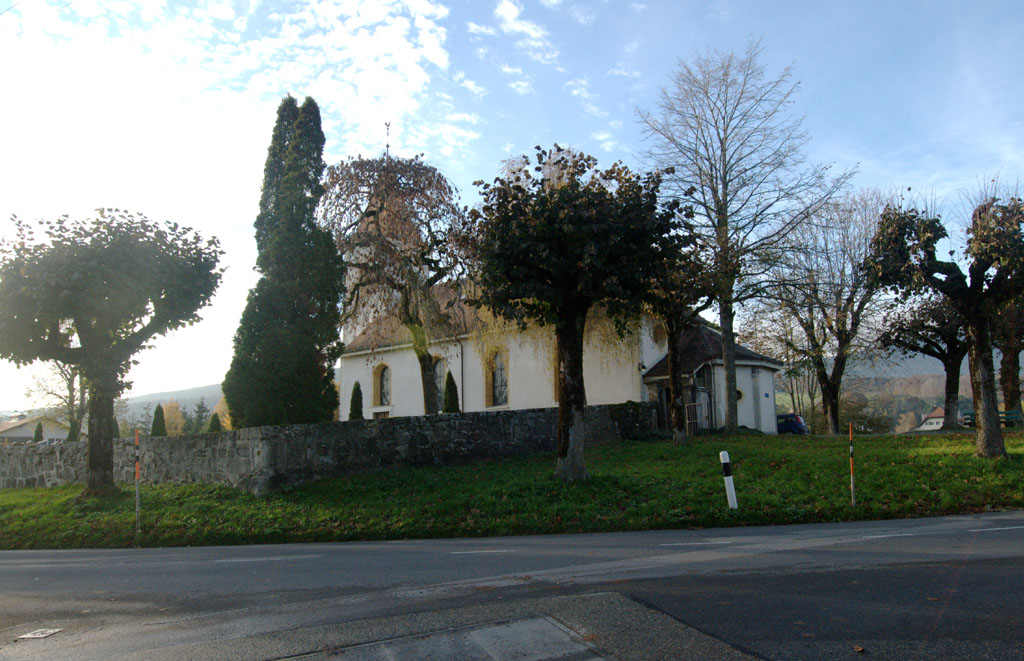 Walking around the curve in Rue du Montilier and then turning and looking toward the northwest, we see this view of the Temple de Lignières (Place de l'Eglise, RACN 010-6456-00197).